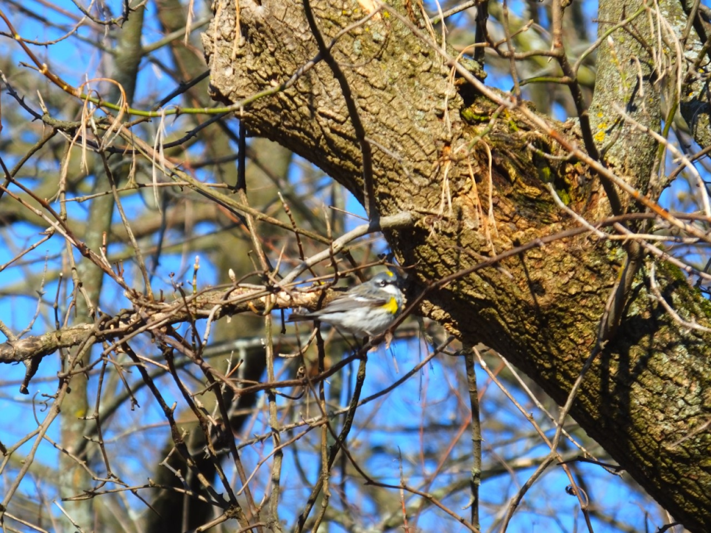 The worse shot, barely good enough for identification, is of a yellow-rumped warbler, I believe. I expected it to be a golden-crowned kinglet, but note the yellow patches at front of wings as well as the crown.