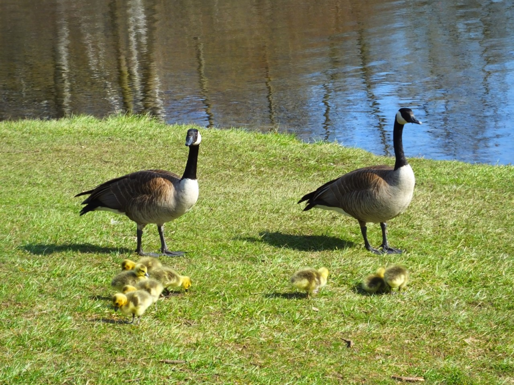 First, and foremost, all eight (8) goslings were chasing their mom around and feasting on the grass beside the pond in the warm morning sun by the time I got there, so they survived another night. Phew! I’m not sure if they even go back to the island any more. Also in attendance were a few mallards, a slew of wood ducks, a hooded merganser pair briefly, and two new canada geese pairs. I don’t know if now that the goslings have hatched that the parents are just less adamant about chasing away the interlopers, or the interlopers are just more adamant about floating around on the pond. There are still chases, but none result in anyone flying off anymore, as was always the case before.