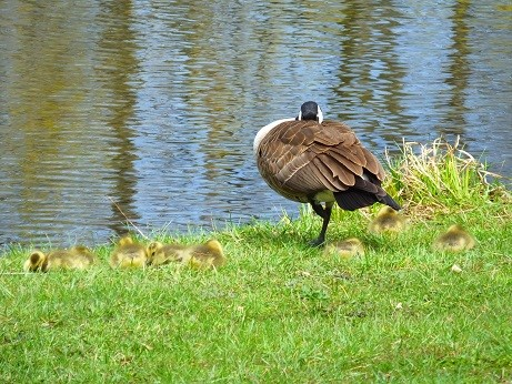 First things first, the pair of canada geese and all 8 goslings are still doing fine. I checked on them yesterday afternoon, and the goslings were out munching on the grass in the drizzle. Today, they were all dried out and catching some zzzs in the sun.