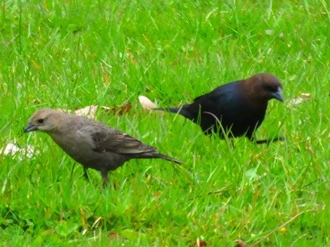 I also spotted a pair of cowbirds, which surprised me a little. The last time I saw them, there were three females working across the lawn looking for tasty morsels, and three males sitting in a tree entertaining themselves. I didn’t even realize they were the same species until I got home and looked them up. Given their habit of laying their eggs in the nest of other birds and not participating in raising their young, I wouldn’t have guessed I’d see a male-female pair doing something so mundane together as just searching through the grass for something to eat, but here they are: