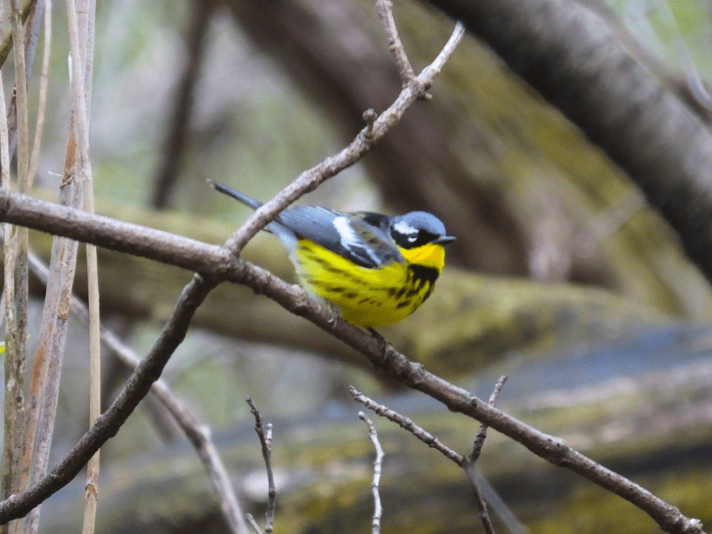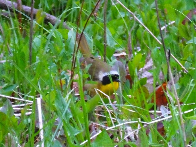 They are a male common yellowthroat hunting for breakfast in the grass and a male magnolia warbler prefering to hunt in the bushes.