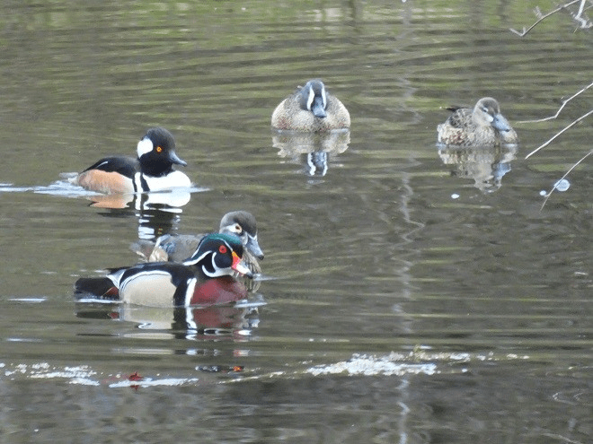 The colors are pretty drab, but there goes a pair of wood ducks, a male hooded merganser, and a pair of blue-winged teals in some kind of multi-species smorgasbord on our little pond. Man, those were good times, eh? Anyway, the teals and mergansers have long since moved on, but the wood ducks are still around.