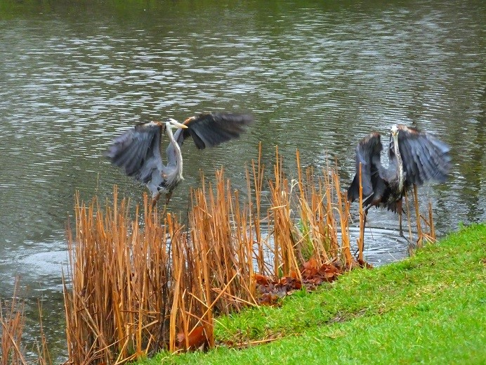 Suddenly, a second Great Blue Heron drifted in, and I thought “well this will be a great photo op,” but for reasons known only to him, he decided to land right next to the first one, and they had a quick and agitated conversation, perhaps about scaring fish away or the optimal heron density on a pond of this size, before one flew right off again.