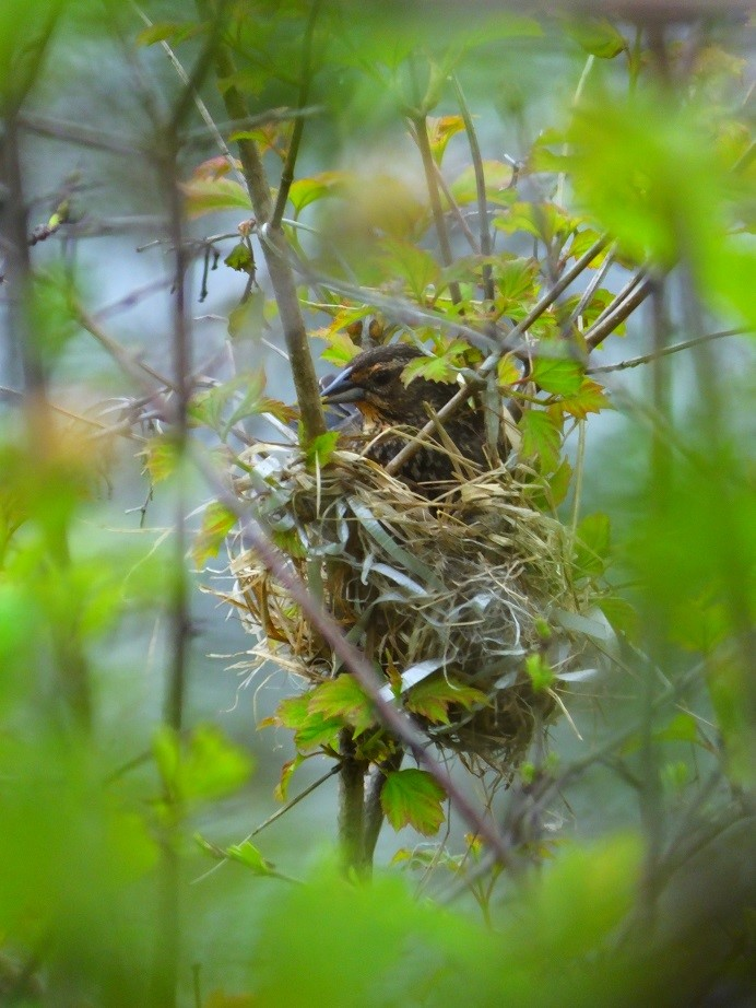 Meanwhile, the red-winged blackbirds at the pond appear to be fixin’ to provide some youngins of their own. Here’s a shot through the sticks and leaves of a female building her nest out over the water. She’s pretty well camouflaged, so you have to look closely to see her. I never would have if she wasn’t also quite busy whistling while she worked.