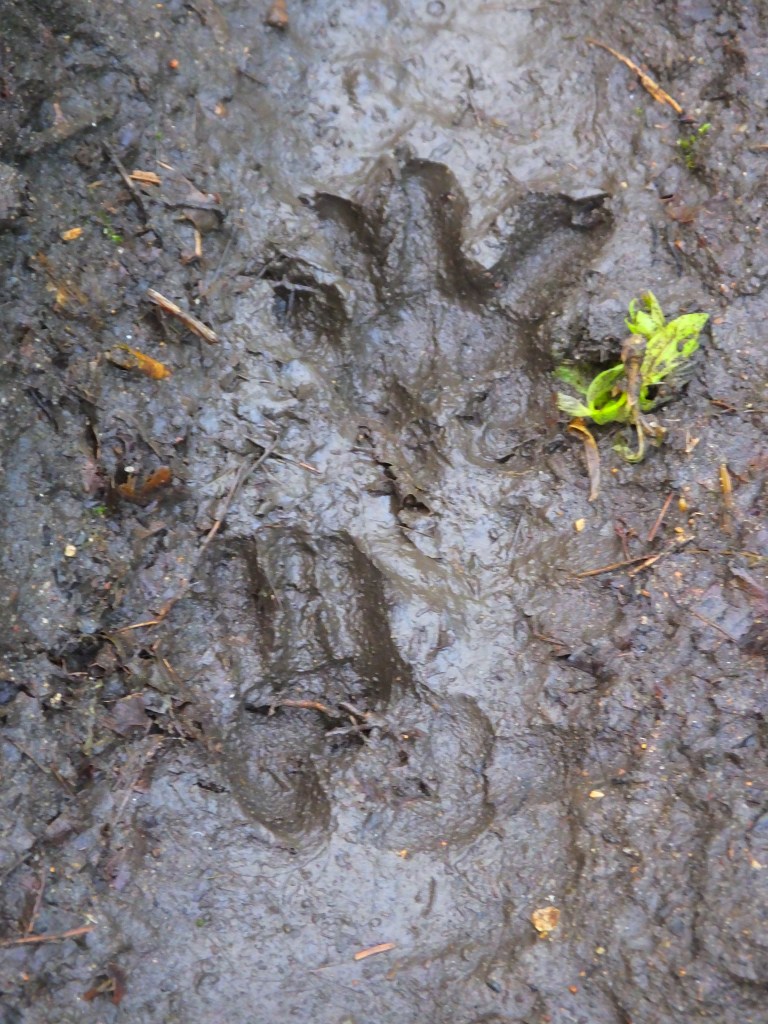 I also spotted the red squirrel again and a new baby rabbit over by the bluff yesterday, but they were too quick for me to photograph. Happily for me, however, a raccoon was nice enough to leave me this nice slow calling card. Eagle-eye Anne has spotted a live one on the Oakleaf Trail recently, so maybe someday I’ll be so lucky.