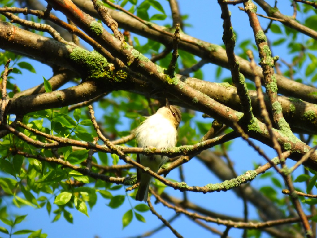 I was over by the river looking up at an oriole, which are everywhere now, and this little guy caught my eye with his bright white belly when he landed on a nearby branch. He proceeded to groom himself and air out in the sun as I proceeded to take picture after picture. Unfortunately, his head was obscured by a twig, and try as I might, I just couldn’t move enough to fix that. Suddenly, he looked down, spotted me, and took off, but by sheer blind luck, I just happened to press the shutter release in the nick of time.