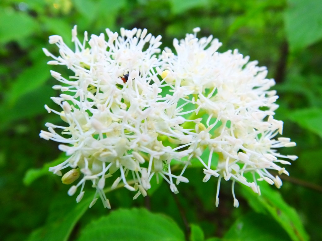 That appears to be the blossom of Cornus alternifolia, also called the green osier, alternate-leaved dogwood, or pagoda dogwood. The leaves sure look like dogwood.