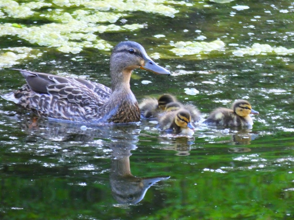 I got out a little earlier this morning, and I’m sure glad I did because I got to enjoy this spectacle of Mrs. Mallard taking her new ducklings on what might be their first tour of the pond. The light was still low, and they were always moving so my camera struggled to capture even this image, but I think it gets the point across.