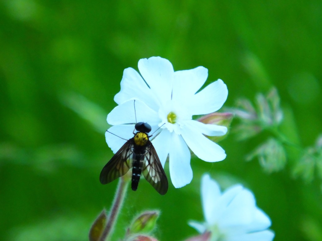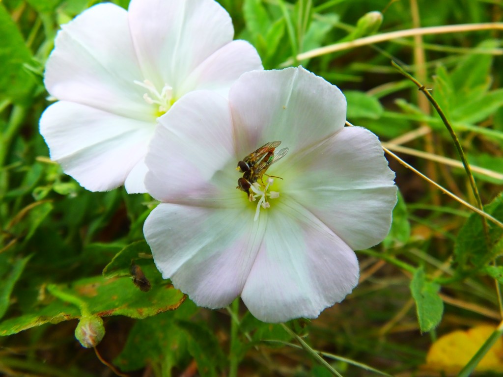 Arachnids are not the only visitors these days. Below, from left to right, we’ve got a Gold-backed Snipe Fly (Chrysopilus thoracicus) on white campion (Silene latifolia subsp. alba), a damselfly of some type on American white water-lilies (Nymphaea odorata), and a pair of tiny hoverflies on field bindweed (Convolvulus arvensis).