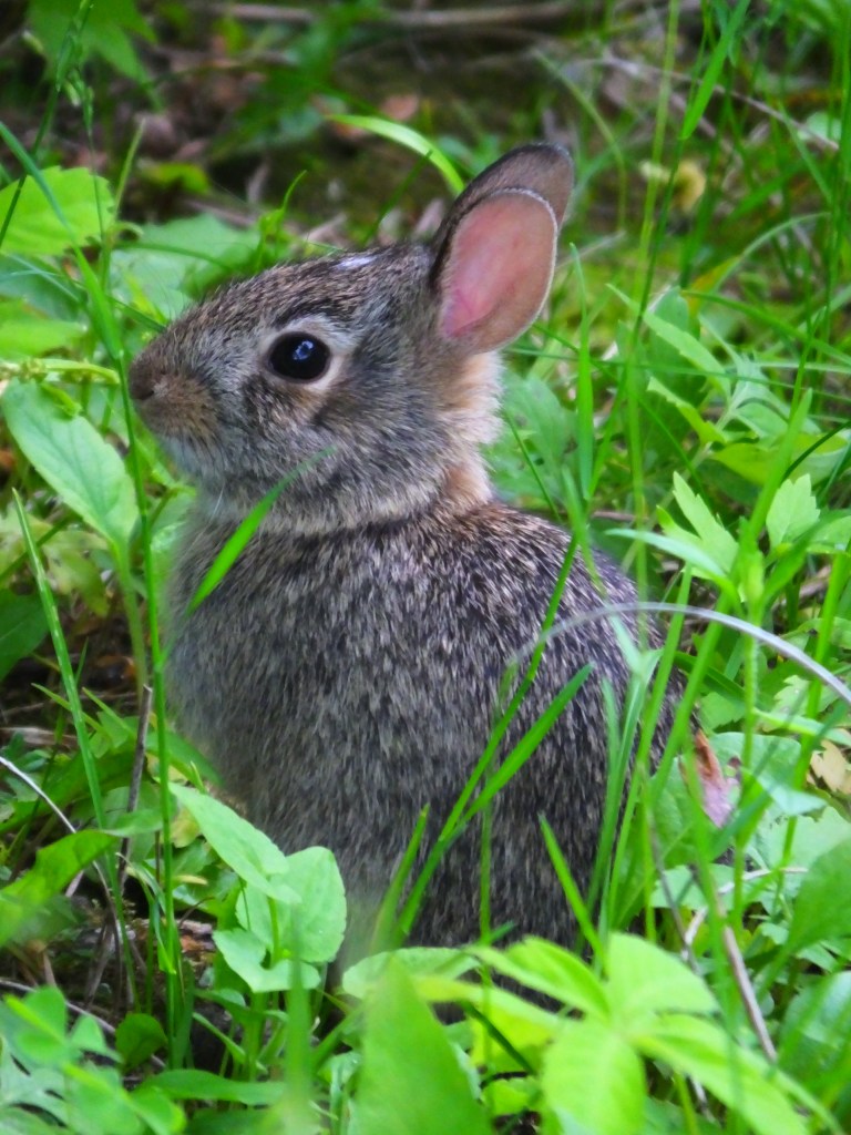 Thanks to eagle-eye Anne, this morning I finally got that baby bunny picture I’ve been after since first spotting them in May. This little cutie, barely bigger than my coffee mug, is probably from a new batch. They grow up so quickly.