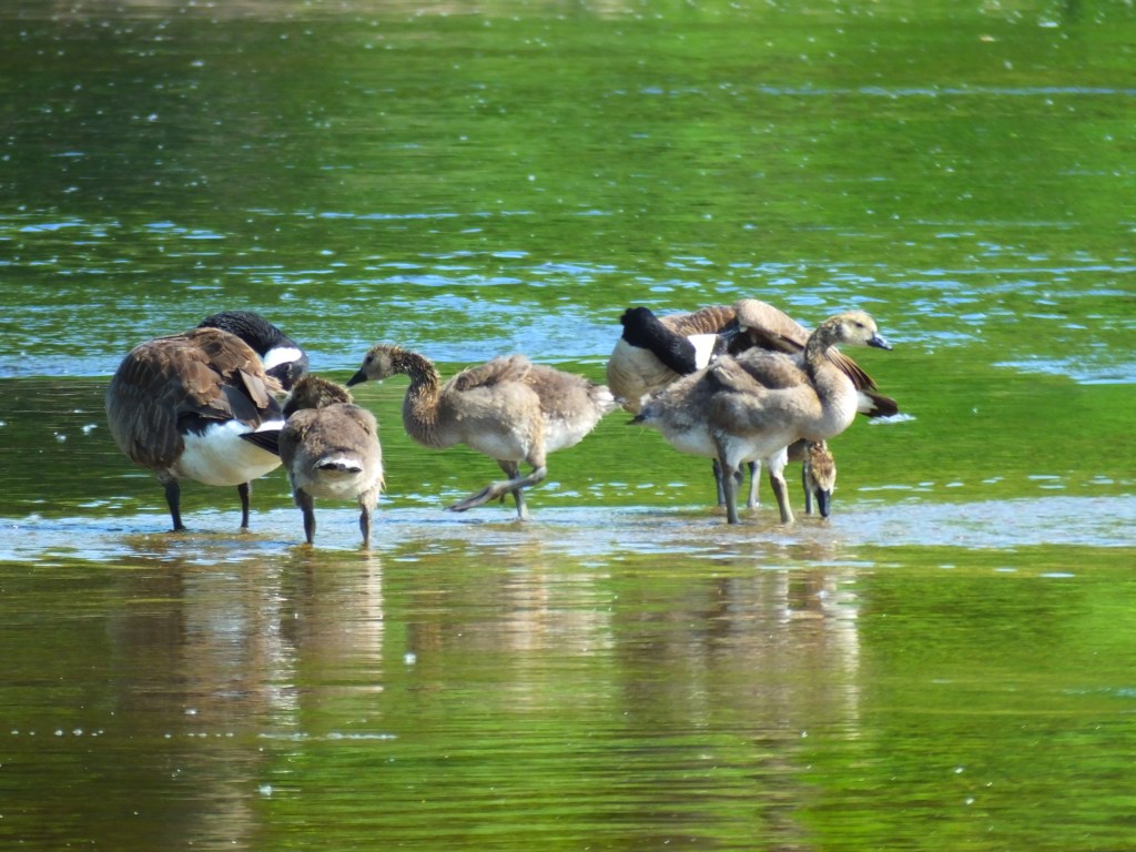 Finally, I spotted a family of Canada geese out enjoying a family bath on a sandbar in the river. There appear to be 4 goslings, so Lord only knows how they might be related to the ones we all got to know and love on the pond, if at all.