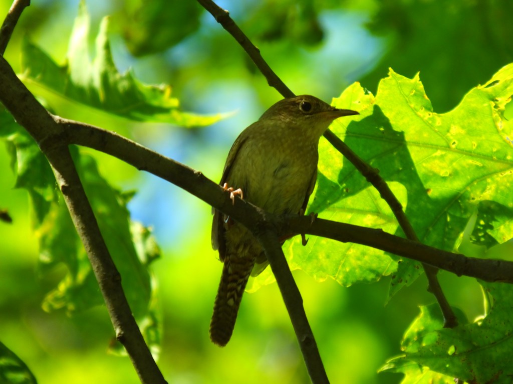 I know we haven’t seen as many birds as we used to. First, the trees now have leaves, and second, I suspect their behavior has changed some as the mating season progresses. Nevertheless, this little house wren, which I first managed to photograph back in May, was distracted enough by his singing duties in the oak tree over the wren house, that I was able to capture one more presentable image.
