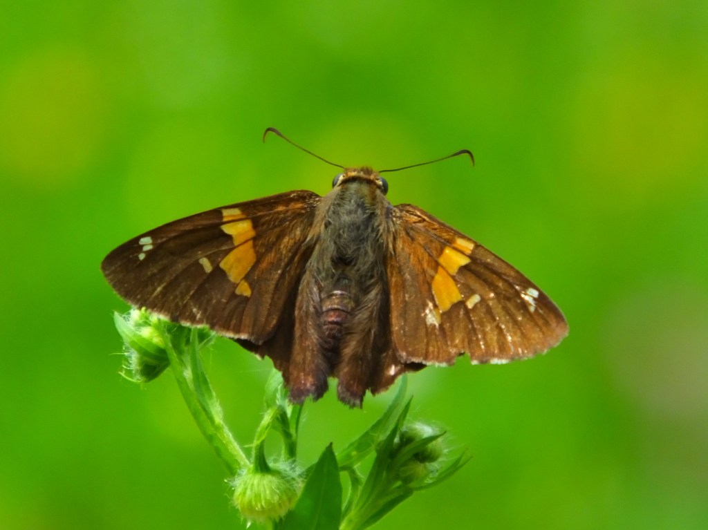 First up is a silver-spotted skipper (Epargyreus clarus), of which we first saw an example just over a week ago. Prancing from flower to flower, this guy was putting on quite a show for somebody, probably not me, but I got to watch anyway. The Pedia of Wik reports that “adult males compete for territory to attract females,” and so that is probably what he was up to.