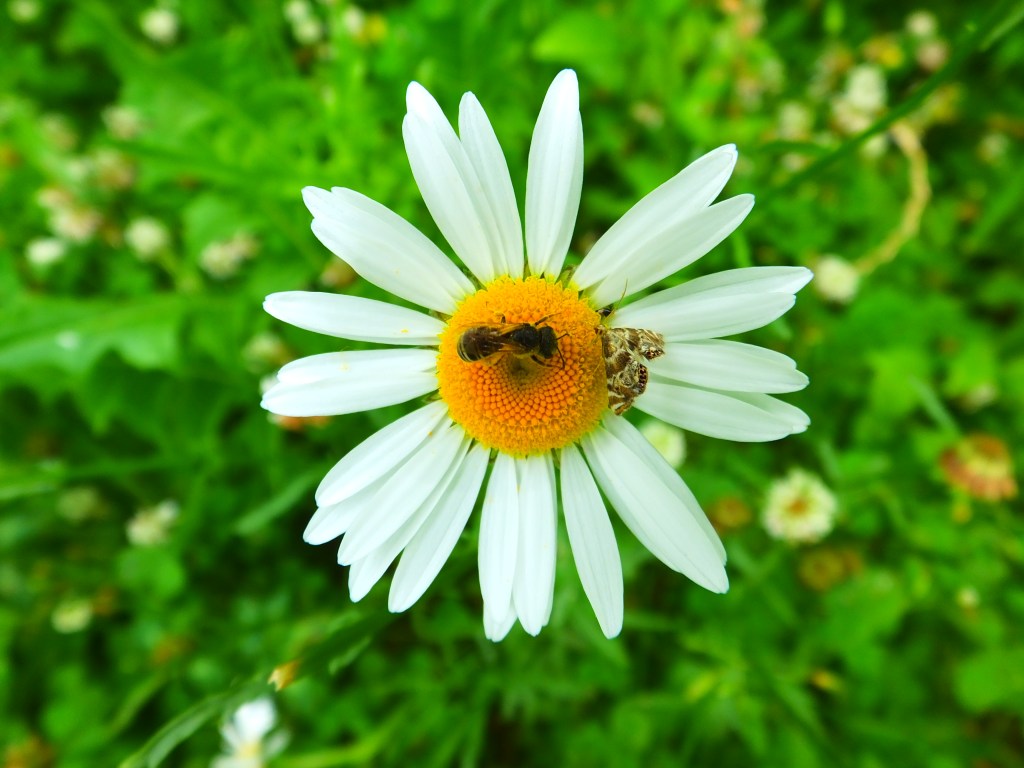 This tiny pair, sharing a single daisy, just barely caught my eye: a tiny bee, possibly a squash bee (Peponapis pruinosa) because of its “very hairy thorax (region behind the head)” and tiny moth, maybe one of the 326 featured on this page (let me know if you spot it).