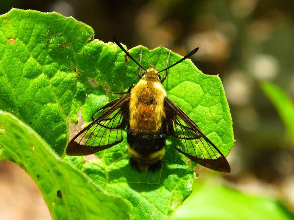Next, I spotted this amazing snowberry clearwing (Hemaris diffinis), a moth that mimics the appearance, but not the sting, of a bumblebee. It may also be called the hummingbird moth, but after watching a hawk moth sip nectar from blossoms, Anne’s hostas and sadly not yet in Estabrook Park, it is my personal opinion that they deserve that title more. Plus, besides the coloration, the snowberry clearwing pictured below is also the size and shape of a bumblebee.