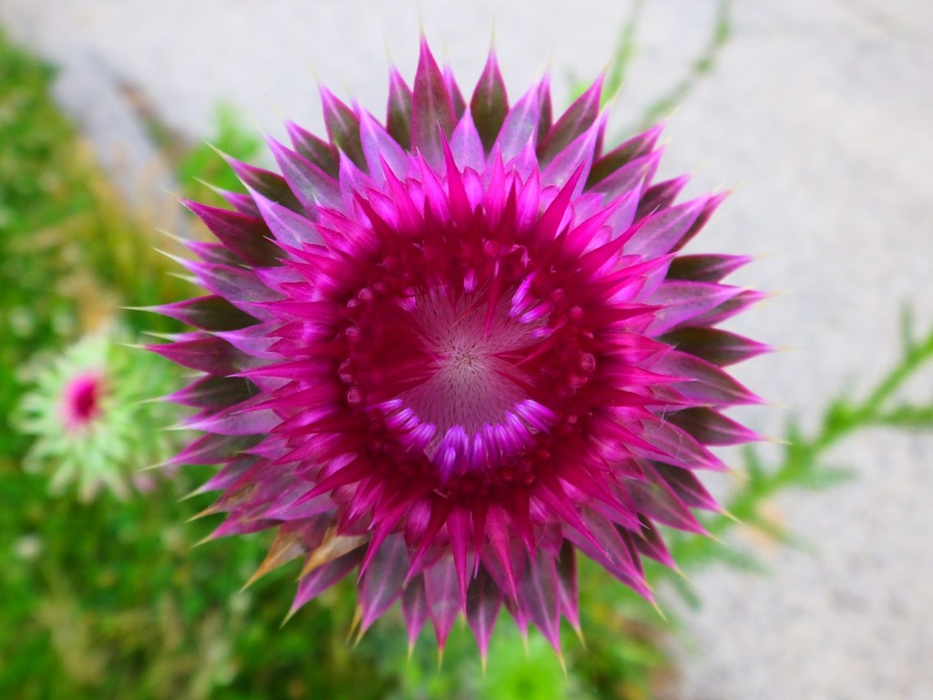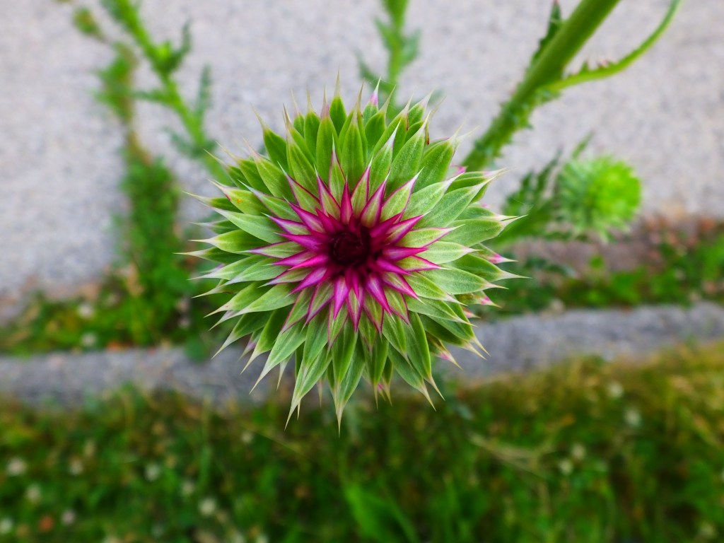 Also striking are the various stages of a nodding or musk thistle (Carduus nutans), an invasive species, I am sad to read, growing out of a crack at the north end of the middle parking lot.