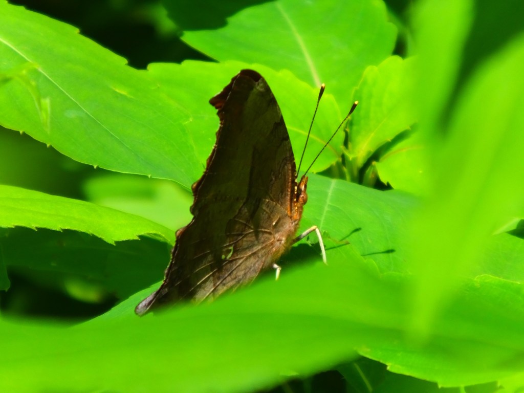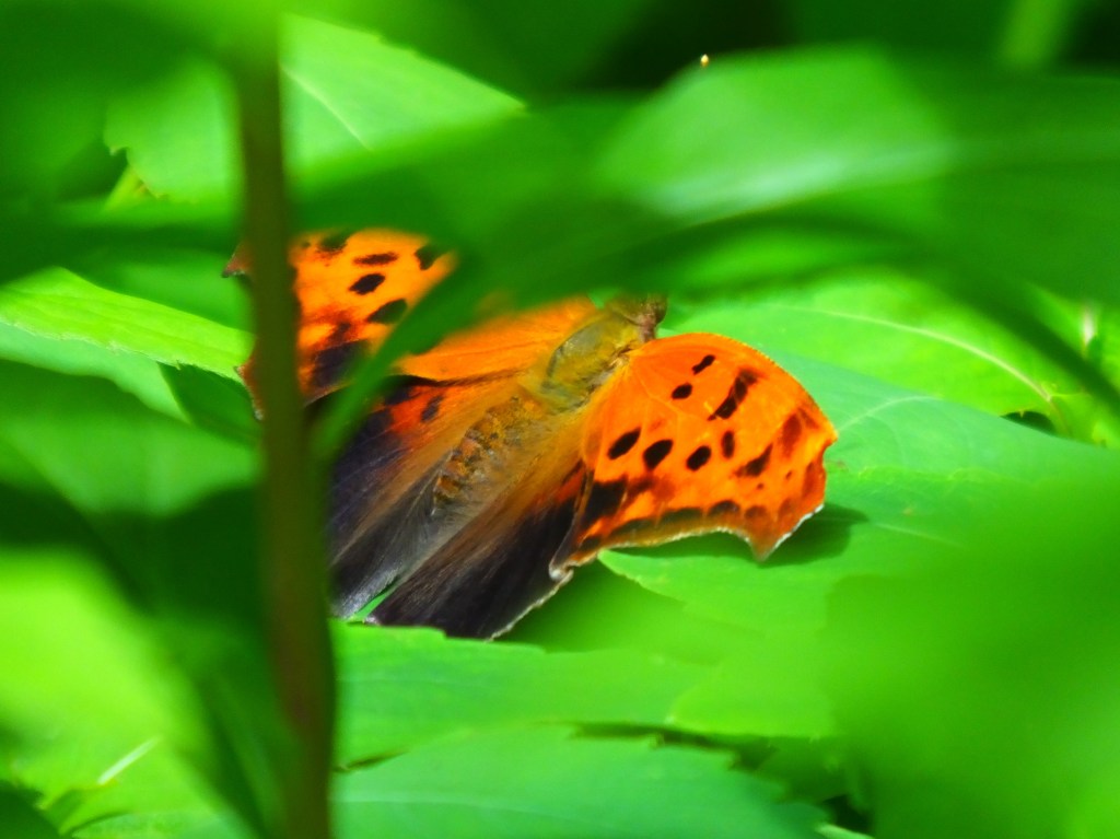 Plus, there’s another butterfly in the wildflower meadow I mentioned a couple days ago. This one is an eastern comma (Polygonia comma) because “there is a silvery comma mark in the middle of the hindwing”, and man, was he shy. The instant he realized I was there; I never saw those beautiful flashy colors again. Good thing I’m finally learning to start recording even before I have a clean view, eh? And they say old dogs….