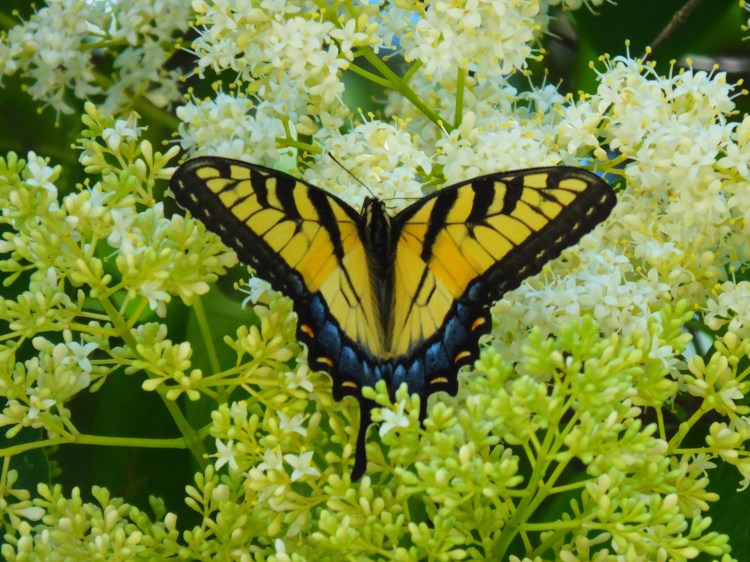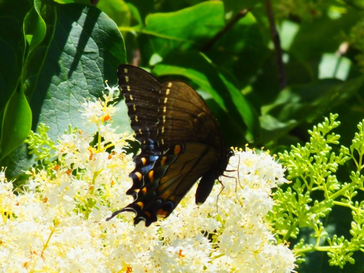 Swallowtails love the big blossoms on the tree between the beer garden and the parkway, which is now putting on an amazing show for eyes and noses. It’s a Japanese tree lilac (Syringa reticulata), which I didn’t know existed, and we have it to thank for now having both a legal (in the park) picture of a male Eastern Tiger Swallowtail (Papilio glaucus) and a female Eastern Tiger, on the same plant! The females of this species may be yellow or black, which is called “dark morph”, and which I was stunned to learn.