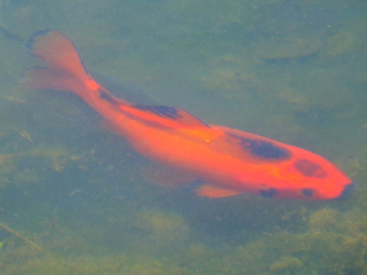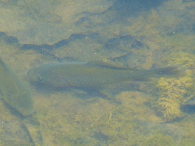 Finally, after yesterday’s first successful fish picture, the other species in the pond appear to be lining up for their photo ops! On the left is probably a common goldfish, bred from Prussian carp (Carassius gibelio), which I did not know, and on the right, I really just don’t know. It looks just like a gray-green version of the goldfish on the left, but maybe an experienced angler can help us out, Steve.
