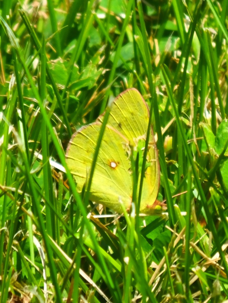 Speaking of a male and female of the same species on the same plant, on the left below is a pair of silver-spotted skippers (Epargyreus clarus) on the same blossom! You may recall we last saw the male in the wildflower meadow earlier this week. On the right is a pink-edged sulphur (Colias interior) making me work again for another unimpressive shot.