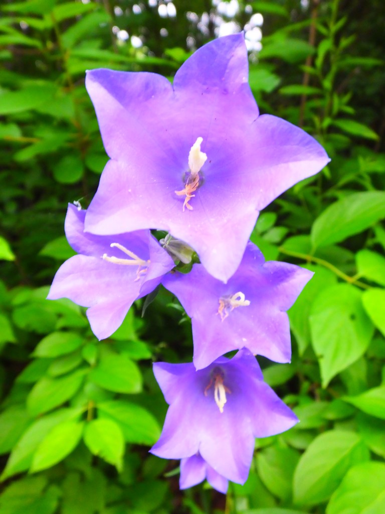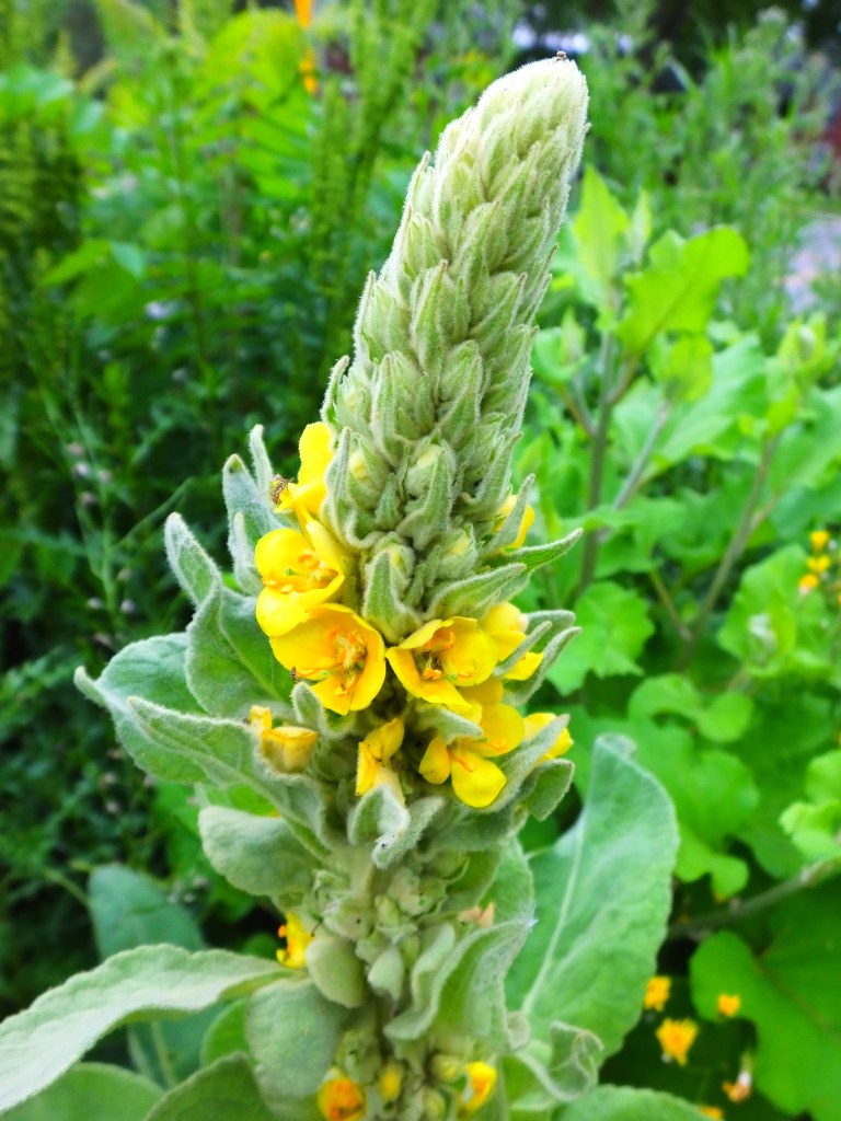 On the left is a member of the bellflower genus (Campanula), maybe peach-leaved bellflower (Campanula persicifolia), based on the written description of the leaves, growing along the Oakleaf Trail, and on the right appears to be blossoms of common mullein aka flannel plant (Verbascum thapsus), which the plant is only able to produce in its second or third year.