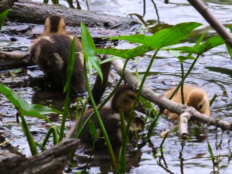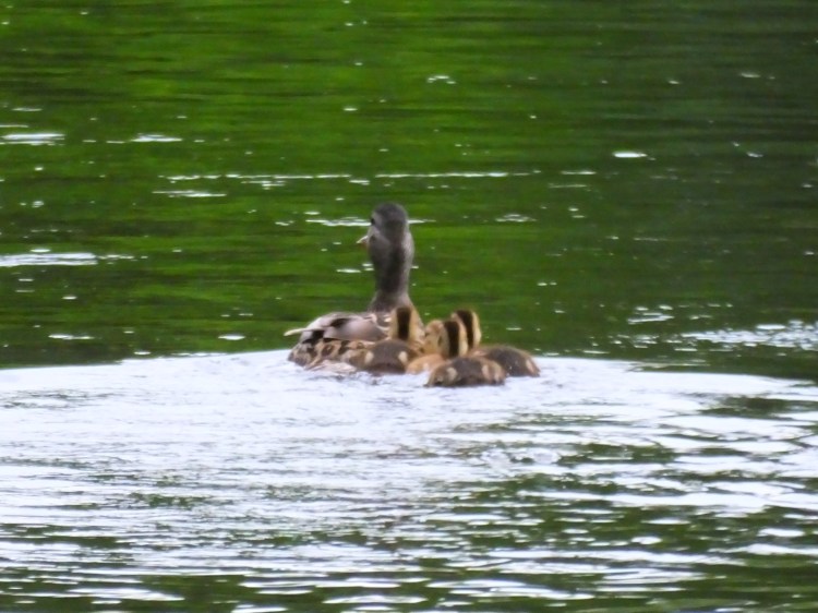 Well, yeah, that’ll work. Or be cute as ducklings, which is amply demonstrated by yet another brood of mallards, this time upriver from the falls, so I’m pretty confident these four are not part of the five we’ve seen earlier in the week downriver. Man, when they are not napping, they don’t sit still for a second. No wonder mom is always exhausted. Oh, and good luck asking the interwebs why one is yellow.