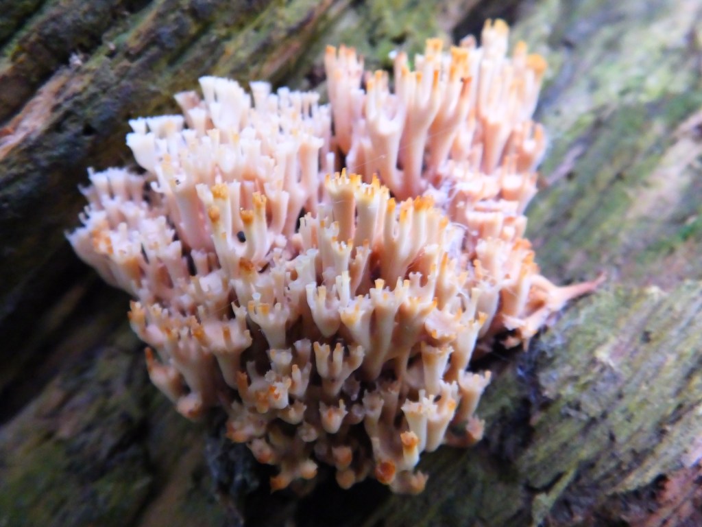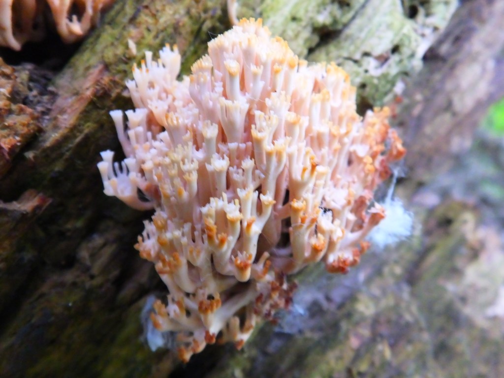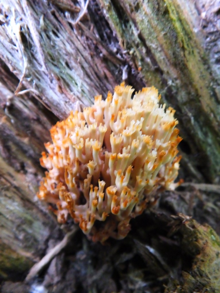 Finally, for something completely different, check out these mushrooms growing on an old log right by where the ducklings were exploring. These may be crown-tipped coral (Artomyces pyxidatus formerly Clavicorona pyxidata), and the Missouri Department of Conservation suggests that you can verify this identification “if you take a tiny taste, it will be peppery.” Be my guest. I can’t make this stuff up.
