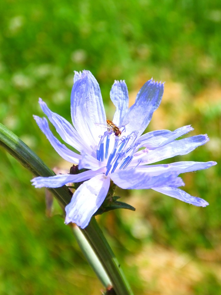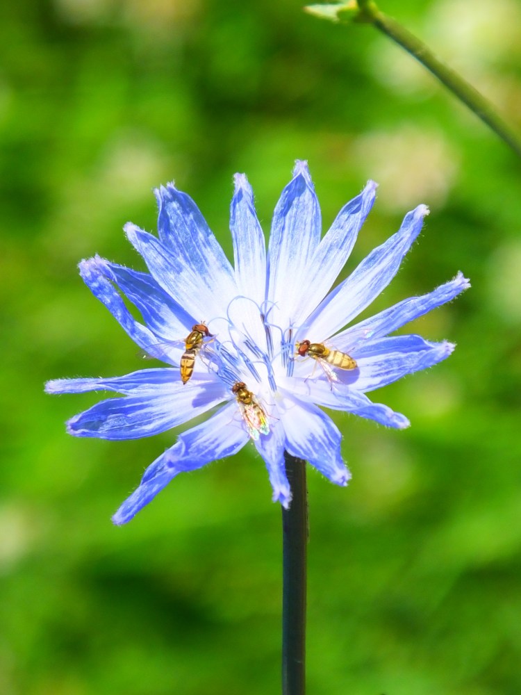 The wild chicory (Cichorium intybus L.) is finally opening, and some little pollinators are already all over it! I think these little guys or gals are all hoverflies of some tiny variety.