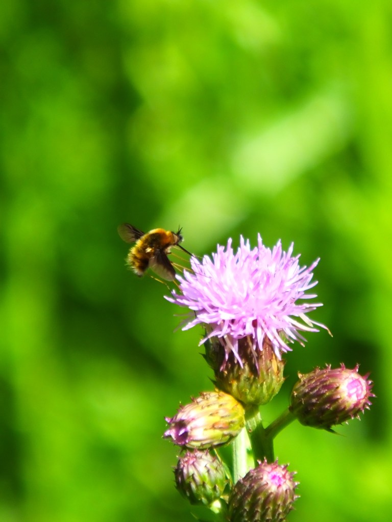 Another type of thistle has opened, unfortunately the invasive Canada thistle (Cirsium arvense) this time, but it is also popular with the pollinators. On the left is a large bee-fly (Bombylius major), a fly that mimics bees but neither bites or stings, and on the right is our ol’ buddy the bicolored striped-sweat bee (Agapostemon virescens), a real bee that can sting, but just a little, and who we first saw last week.