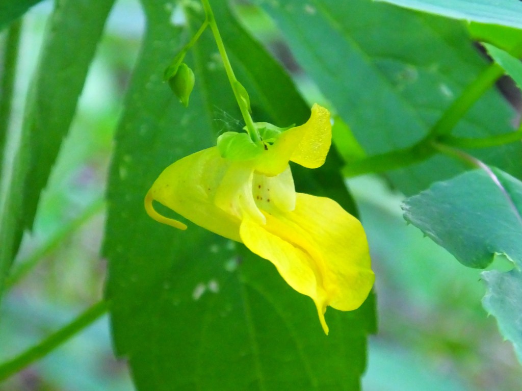 Also down by the river are more jewelweed, but in yellow instead of the orange we saw yesterday. This yellow jewelweed or pale jewelweed (Impatiens pallida) can grow right beside the closely-related orange jewelweed (Impatiens capensis) and has a slightly larger blossom. We’ll have to check and see which species is better at launching its seeds, eh?