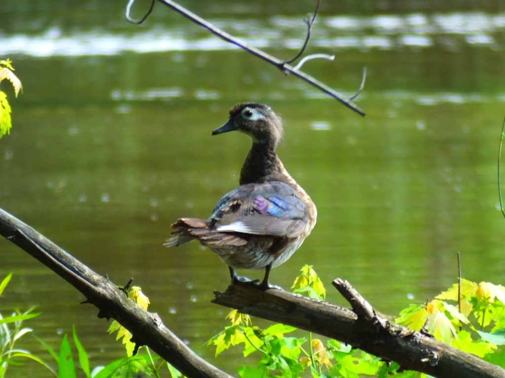 I found our Mrs. Wood Duck down on the river yesterday afternoon, instead of up on the pond where we just saw her last, and it appeared that she had some youngins with her, but they quickly got and stayed out of sight. I didn’t see them this morning, but I’ll keep my eyes peeled. Here she is demonstrating her ability to perch in trees, and I read that hers is the only North American duck species that have the long toes with claws necessary to do so. I’ve spotted them in trees by the pond before, but never managed to get a shot till now.