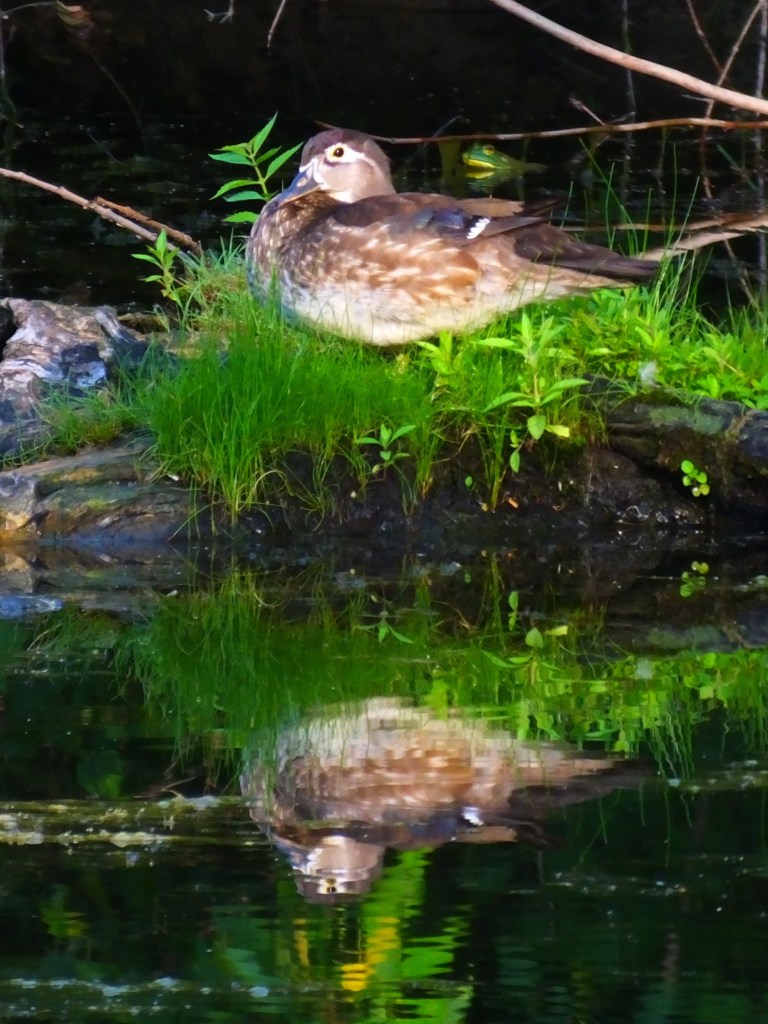 Meanwhile, this morning in the park, there was a sole wood duck hen on the pond but no duckling, and we all hope against hope that the duckling was just elsewhere, right? And ha! Check out the frog photobombing our picture that I only just now noticed.