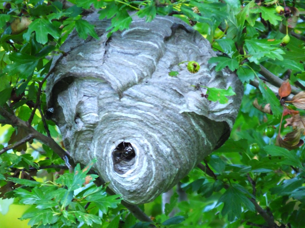 Finally, some bald-faced hornets (Dolichovespula maculata) are expanding a nest in the little fruit tree on the northeast lawn of the pond. Sorry, but I’m not getting any closer.
