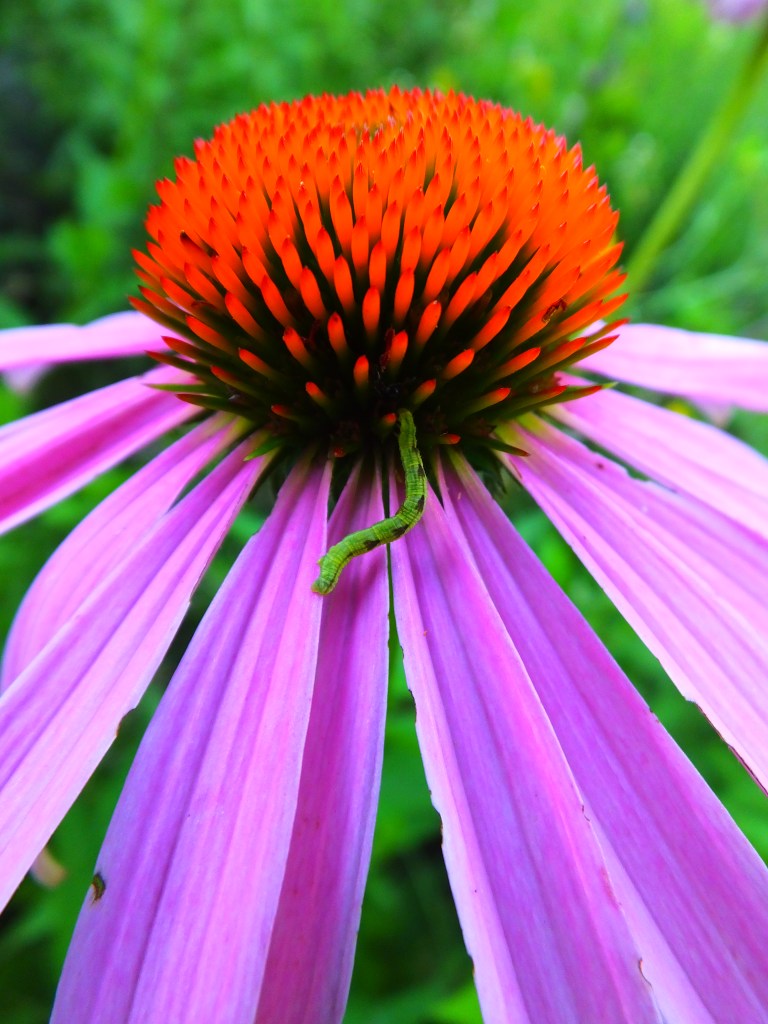 A tiny, bright green inchworm was checking out what looks to be an eastern purple coneflower (Echinacea purpurea) on the steep slope from the beer garden down to the river.