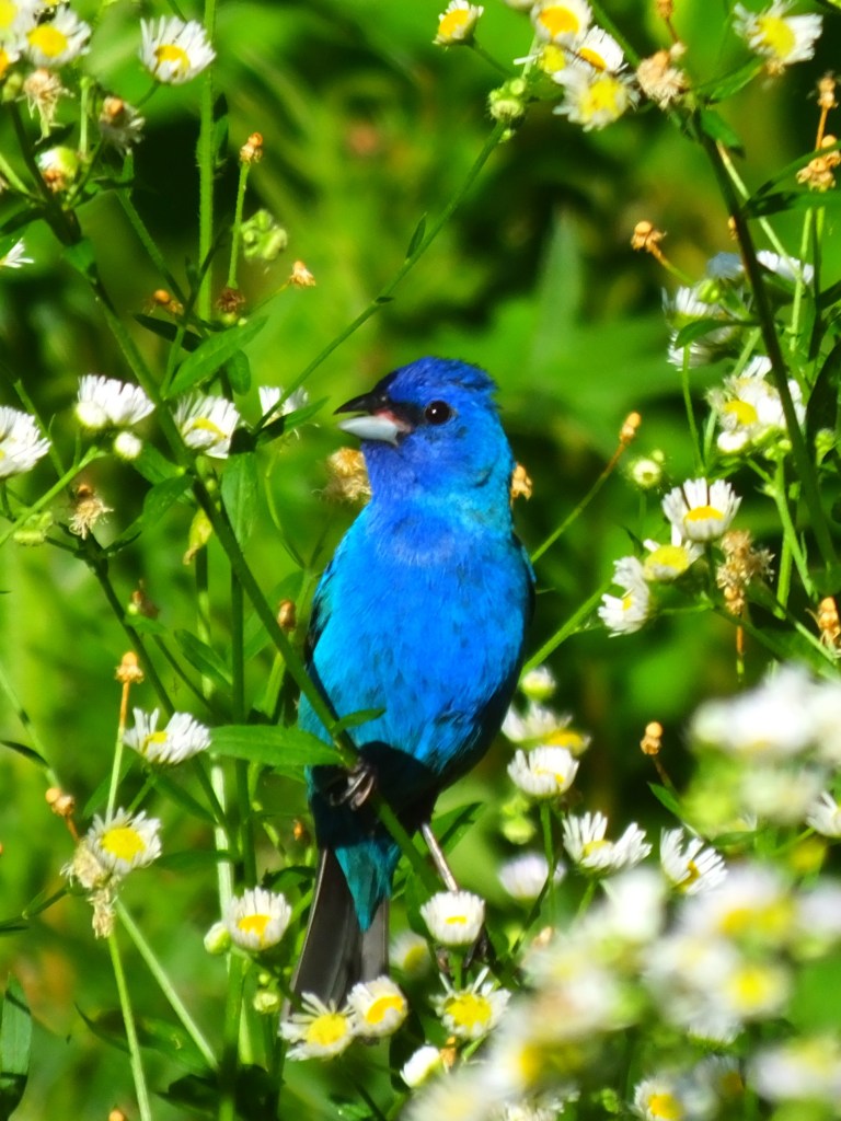 The indigo bunting (Passerina cyanea), in the wildflower meadow by the river, is perhaps becoming less annoyed by my presence.