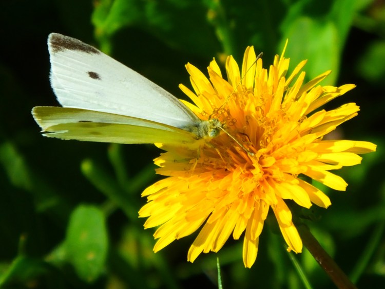 A cabbage white (Pieris rapae) was taking its time with a common dandelion (Taraxacum officinale) blossom.