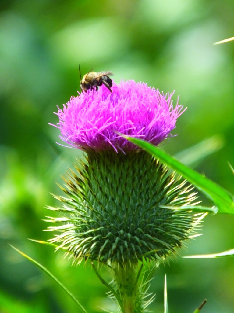 A bumblebee was hard at work on the newly opened blossom of what appears to be a spear thistle, bull thistle, or common thistle (Cirsium vulgare), “the national flower of Scotland.”