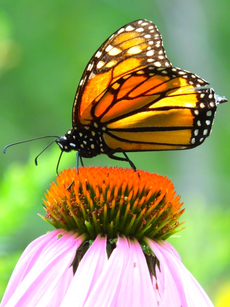 First, the good news. A monarch butterfly seemed to really enjoy that eastern purple coneflower (Echinacea purpurea) on which we saw a green inchworm just yesterday.