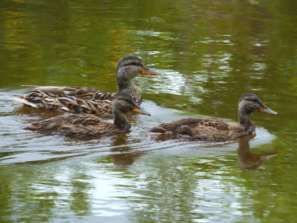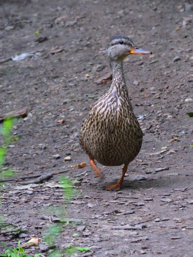 I’ll spare you the suspense and report that the biggest down was me falling into the river. Don’t worry! The camera is fine, and I’ll dry out. I did manage to get this picture, however, of the mallard hen with her two nearly-grown ducklings before I went in. We’ve seen them a few times before at the big mud flats down the bank from the southern playground.