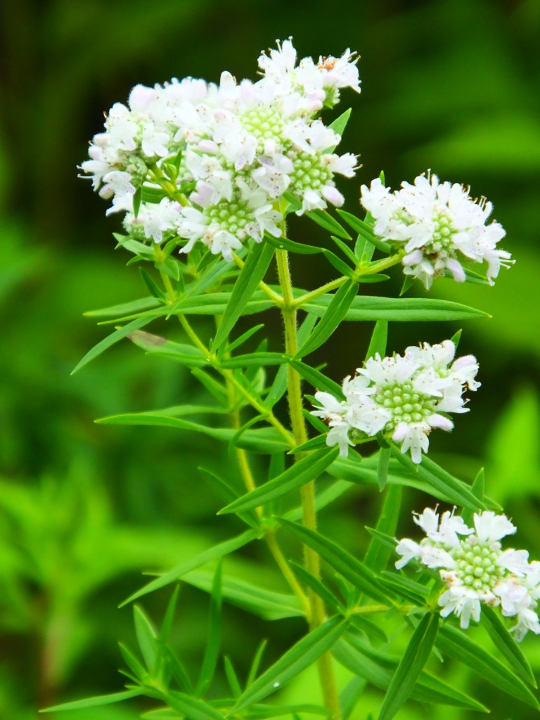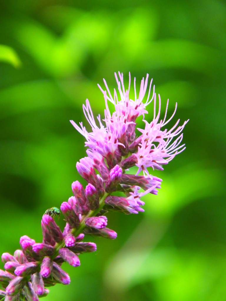 After the detour, I got back down to the river and spotted these pretty new flowers below the beer garden. On the right/top might be small-head blazing star (Liatris microcephala), a not-very-dense dense blazing star (Liatris spicata), or even prairie blazing star (Liatris pycnostachya); and on the left/bottom might be Virginia or common mountain-mint (Pycnanthemum virginianum).