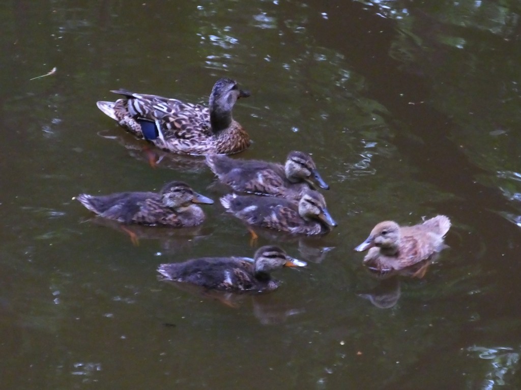I finally reached the oxbow pond north of the falls and found our mallard family with the yellow duckling, and this morning mom and all five ducklings are back together! Woo Hoo! Maybe junior just felt off and was self-quarantining for the day, eh?