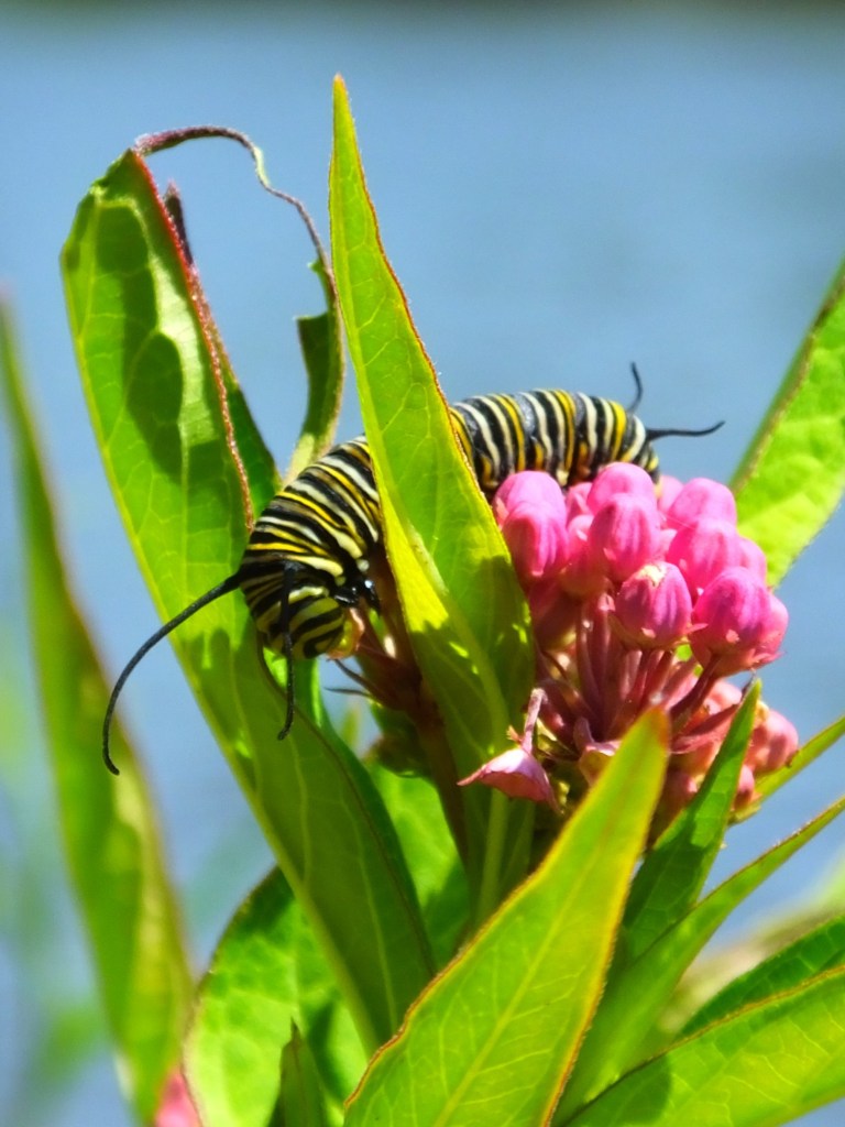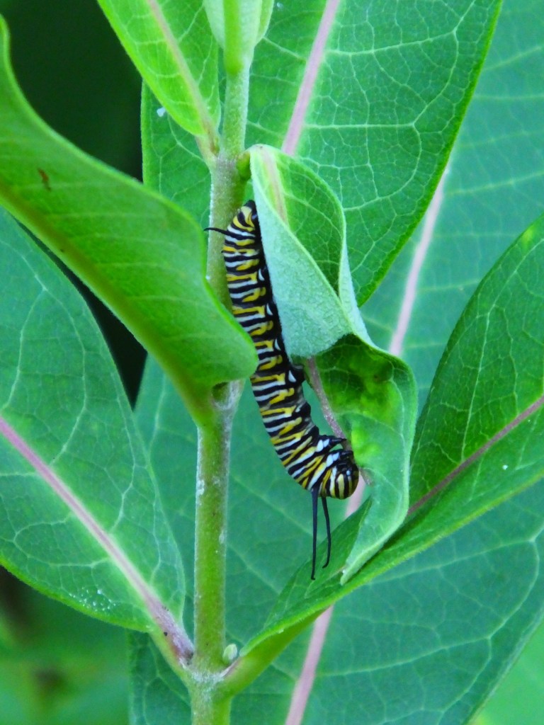 Generation 3 or 4 monarch caterpillars are busy munching on milkweed, both common milkweed by the pond and swamp milkweed by the river.