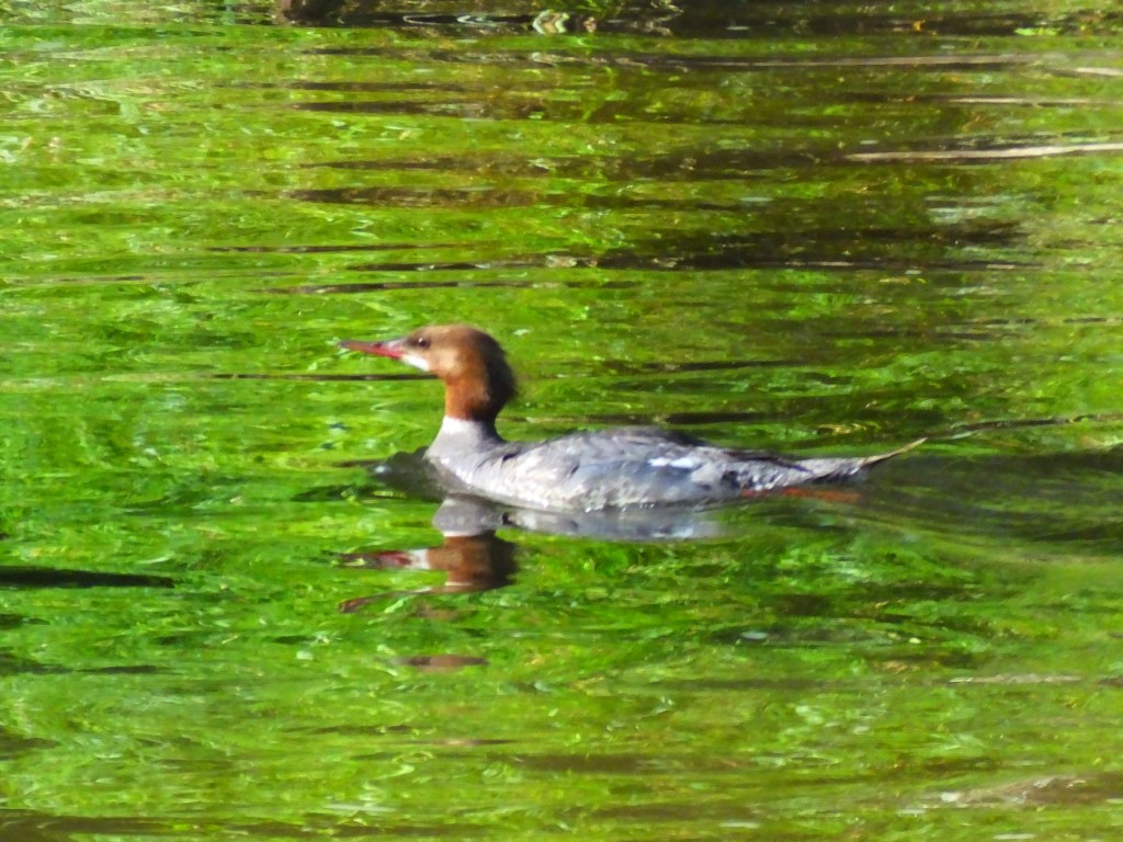 And just to keep things interesting, a female or juvenile common merganser (Mergus merganser), which I don’t believe we’ve seen in the park before, was heading down river this morning. After I caught just enough of a glimpse with my binoculars to know it was something special, I had to drop everything and sprint down the river trail to get along side of it for even this not-too-great image. Yay! Something new.