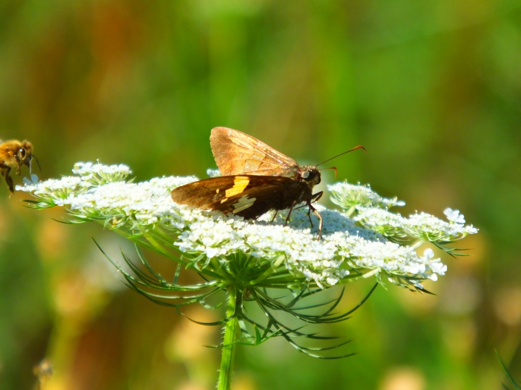 Wow. That’s a lot of waterfowl all of a sudden. Happily, there were some bugs out and about to mix things up a bit. First up is our old buddy, the silver-spotted skipper (Epargyreus clarus). This morning he chose Queen Anne’s Lace to pose on and got photobombed by a bee.