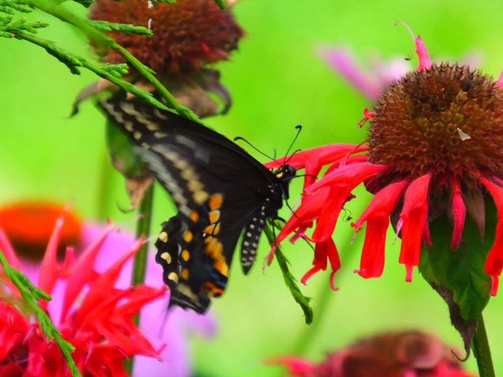 This flighty black swallowtail swung by, but didn’t really stop. The purple cornflowers were right there, but he wanted to sip from this red bergamot without taking a break from fluttering.