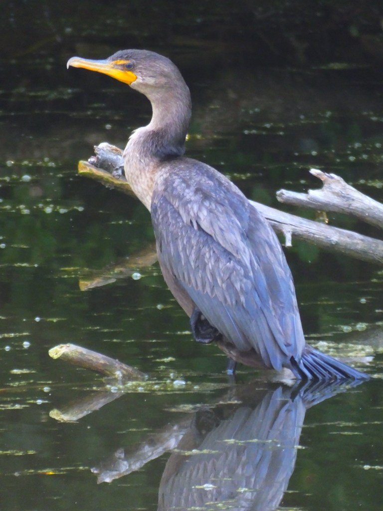 First up is what appears, for all the world, to be a double-crested cormorant (Phalacrocorax auritus), right there on our pond, and this one seems to be yet another juvenile, based on its neck and chest looking paler than “all black”. You may recall seeing an image of them in a v-formation flying over the park back on May 14, and I never expected to have the pleasure of seeing one this close.