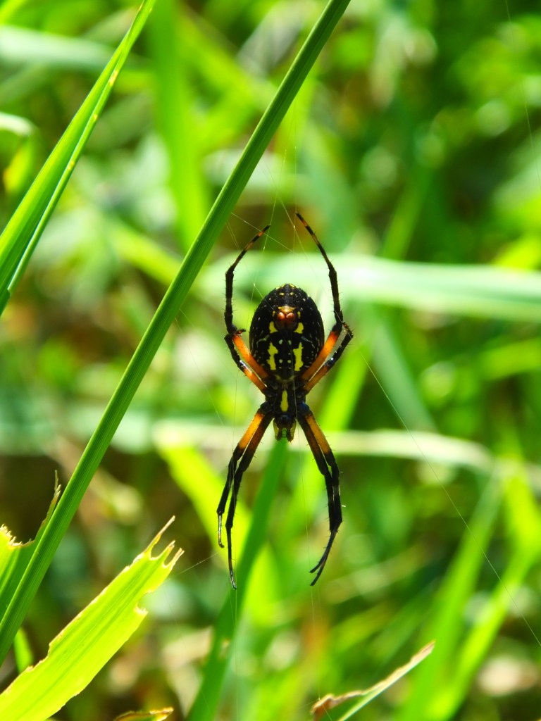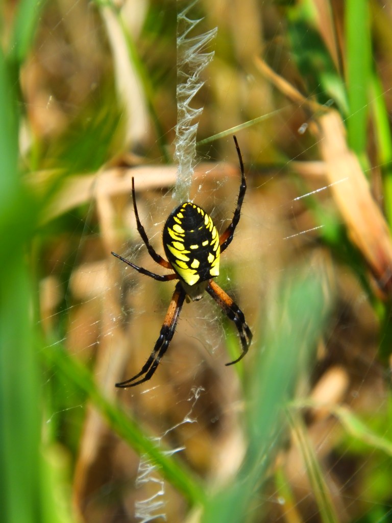 Meanwhile, down by the river, this critter scared me almost as much as the living and flying giant ichneumon wasp (Megarhyssa atrata) I told you about back in July. This time, she’s a female yellow garden spider, black and yellow garden spider, golden garden spider, writing spider, zigzag spider, hay spider, or corn spider (Argiope aurantia), which is a member of the family Araneidae, the orb-weavers, and “may bite if disturbed or harassed, but the venom is harmless to non-allergic humans, roughly equivalent to a bumblebee sting in intensity!” That’s an odd definition of harmless, eh? “Males range from 5–9 mm (0.20–0.35 in); females range from 19–28 mm (0.75–1.10 in),” and she was easily that big.