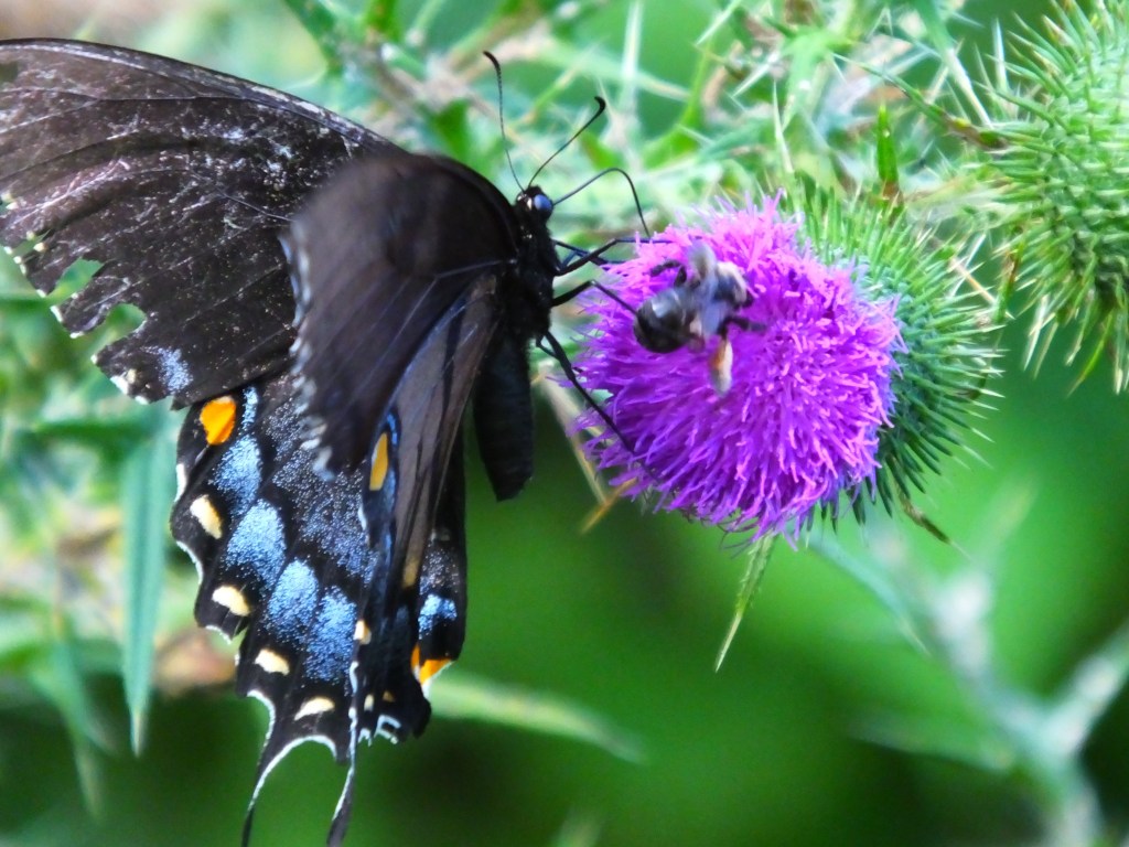 I don’t have good data on the fluctuations in nectar production by the various flowers in the park from day to day or week to week, but it has been dry lately, and perhaps we’re in a little bit of a low spot because this looks like some serious competition on a bull thistle blossom. The female dark morph eastern tiger swallowtail (Papilio glaucus) didn’t stick around long after the bumblebee showed up.