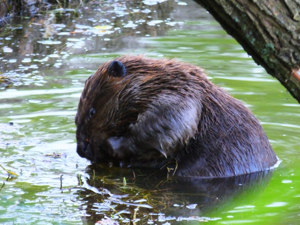 A beaver, but just one this time, was back at the same downed cottonwood as yesterday munching on bark again. It would dive under the water, the branch would jiggle a little bit, and then it would come back up with a new piece of bark to work on.