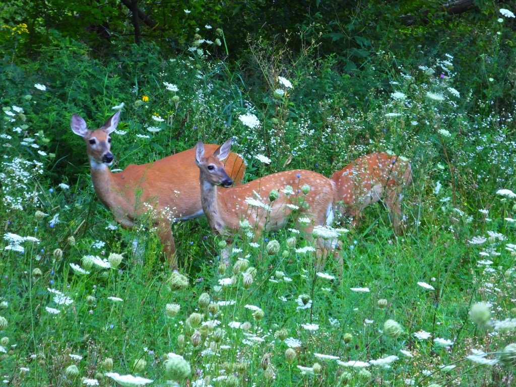 The surprise in the park this morning was not a new critter but critters in a new spot. The doe and her two fawns, which we’ve often seen on the soccer fields at the south end, were visiting the north end, perhaps to sample the vegetables in the wildflower meadow, were we saw the buck back in July.